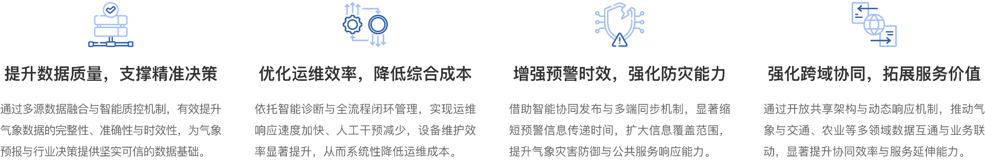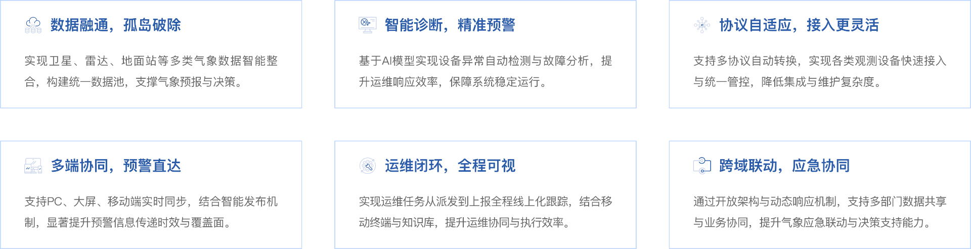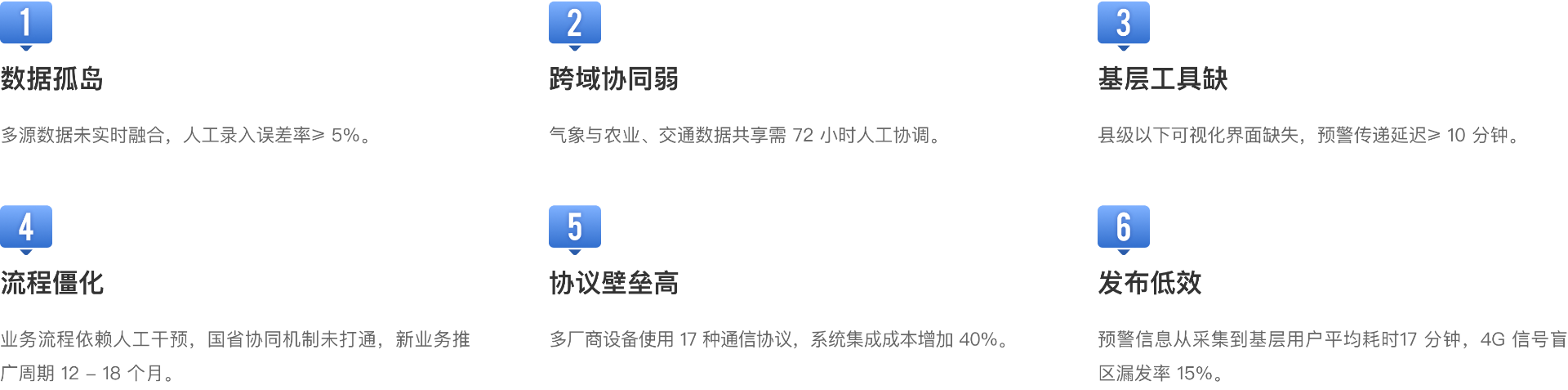传统气象运维面临数据孤岛、跨域协同弱、基层响应慢等痛点:多源数据未实时融合,人工录入误差高;跨部门信息共享效率低;基层预警传递延迟明显;业务流程僵化,系统扩展困难;设备协议不一,集成维护成本高。这些问题制约了气象服务的精准性、时效性与协同能力。